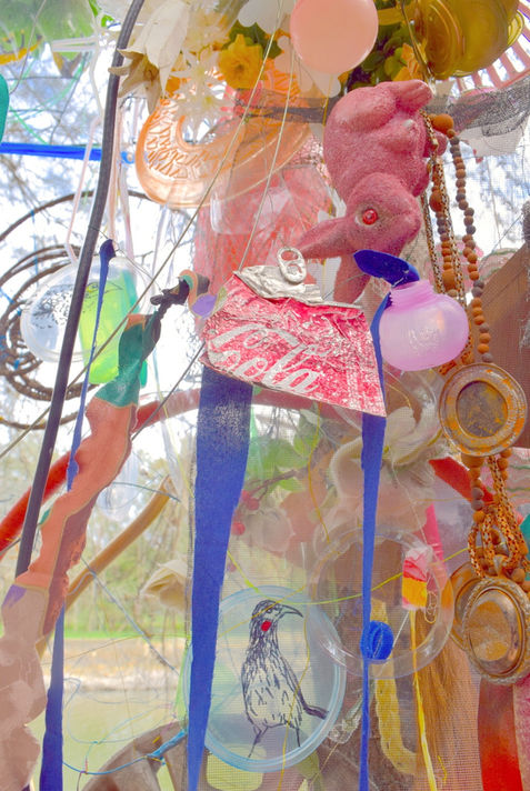 Made with locally found street throw-outs and incidental detritus, this temporary installation was suspended along the Hawthorne Canal in Sydney's GreenWay. In a grove of Casuarina trees—once a safe refuge for children while their mothers collected bush foods—this space, along with the birds, invites festival visitors for an intimate entanglement.